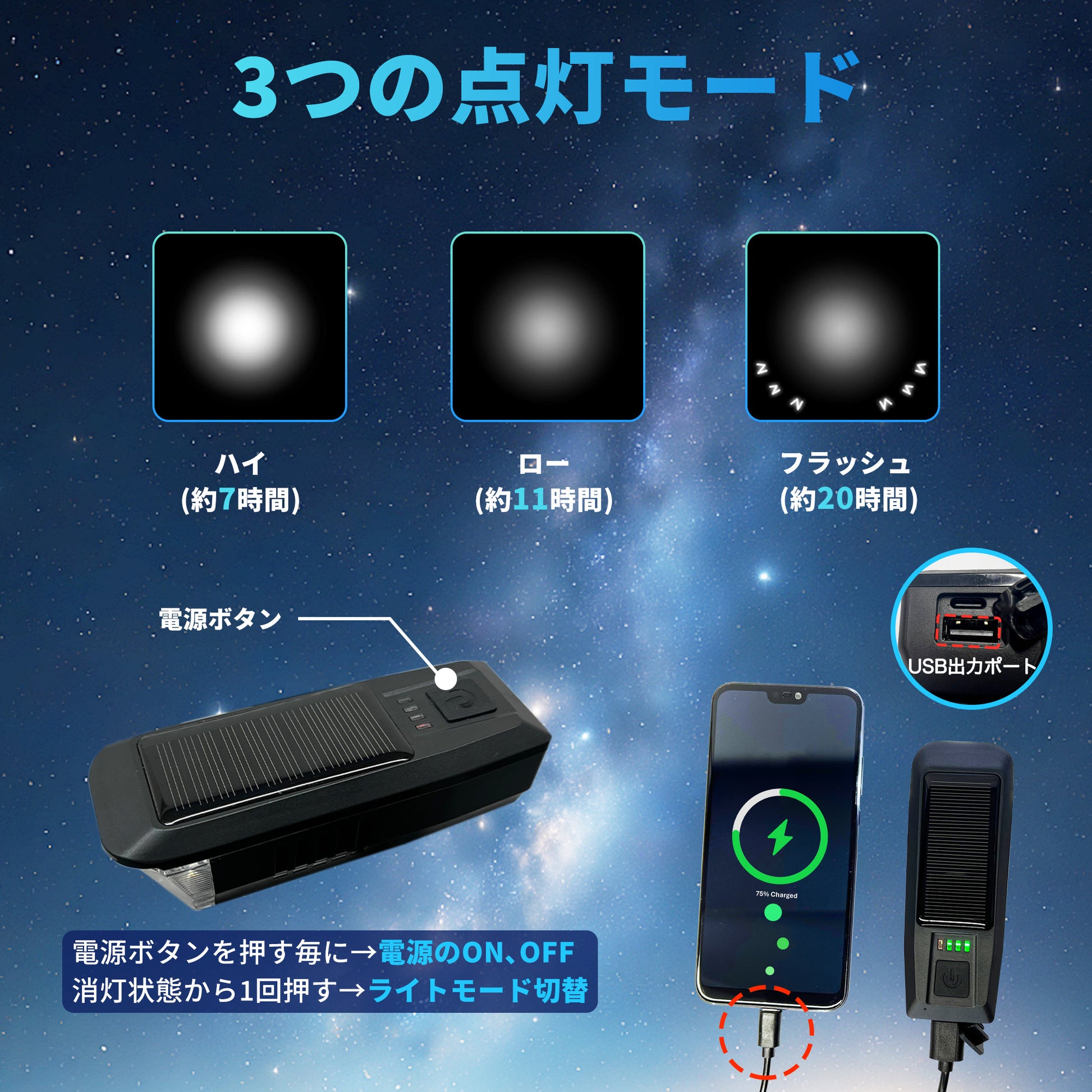 ●【3つの点灯モード&スマホを充電可能】 ハイ・ロー・フラッシュ3つの点灯モードを備え、スイッチを1押しで、ライトモードの切り替えができます。チャージアウト機能も搭載されています。大ピンチの時にはライトを点灯しながら、スマホを充電できます。