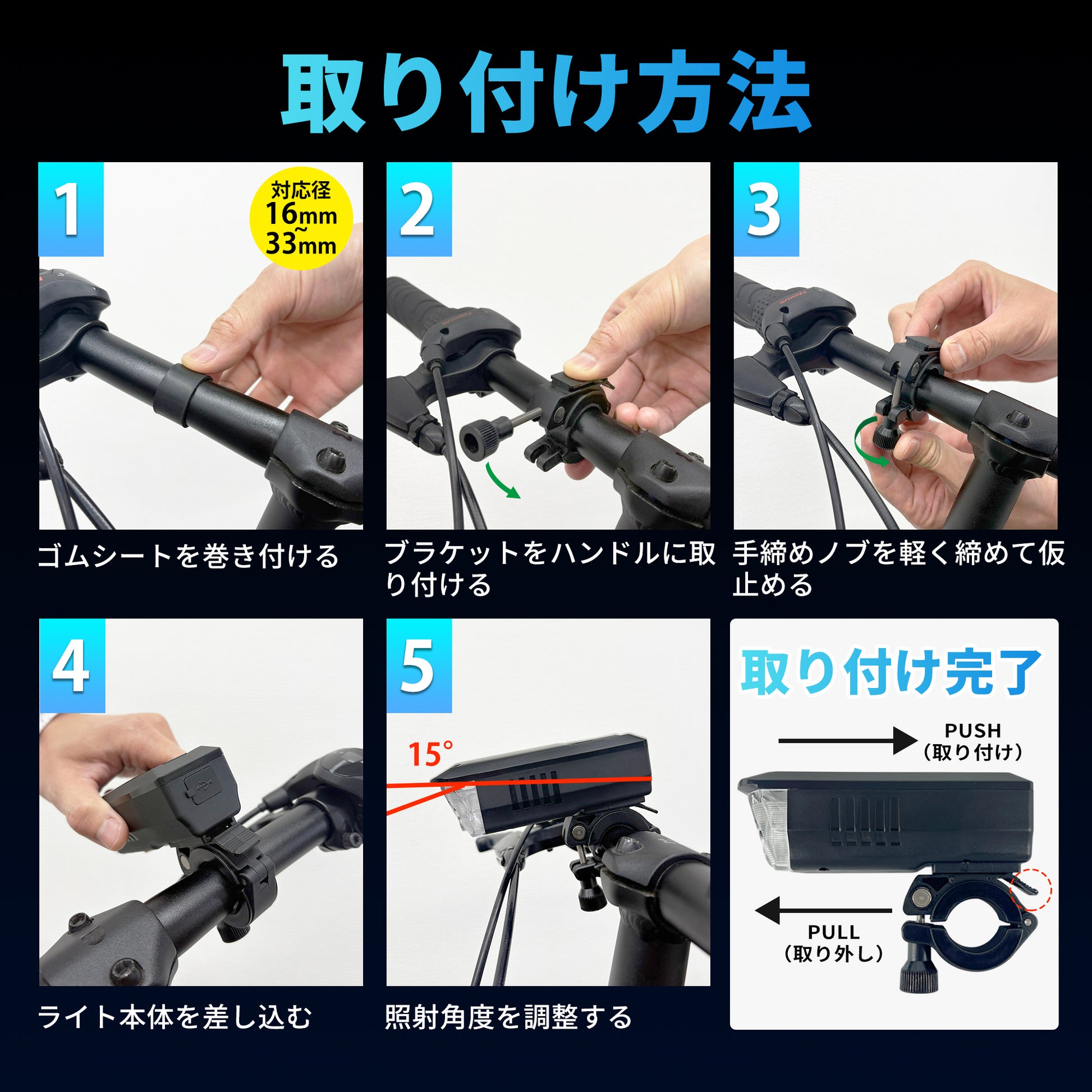 ●【新型ブラケット】新モデルでは、新型の台座を採用し、工具不要でらくらく取り付け可能! コンパクトなボディーと調整式ハードマウントにより、どんなハンドルバーにもライトをしっかり取り付けられる